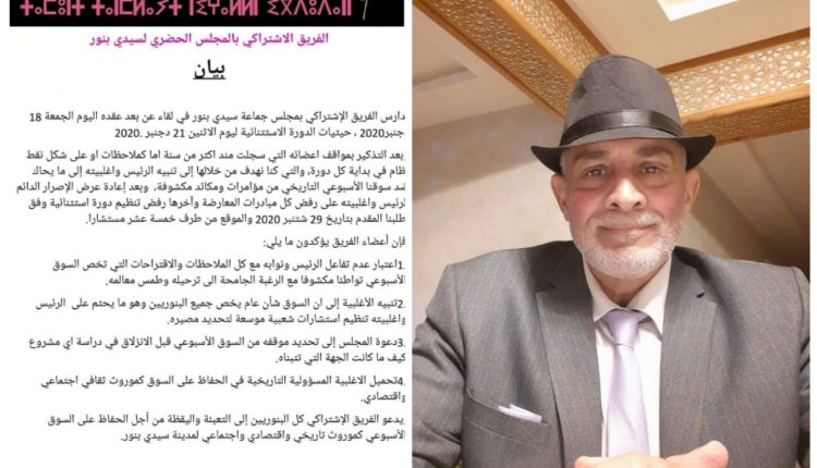 ضد ااسوق الأسبوعي التاريخي من مؤامرات ومكائد مکشوفة، وبعد إعادة عرض الإصرار الدائم للرئيس واغلبيته على رفض كل مبادرات المعارضة وآخرها رفض تنظيم دورة اسثتنائية وفق الطلب المقدم بتاريخ 29 شتنبر 2020 والموقع من طرف خمسة عشر مستشار افإن أعضاء الفريق يؤكدون ما يلي: