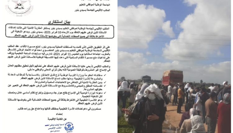 على إثر التطويق الأمني الذي قامت به السلطات المحلية بسيدي بنور ،لمنع مسيرة الأقدام ،عقد المكتب الاقليمي للجامعة الوطنية لموظفي التعليم بسيدي بنور المنضوي تحت لواء الاتحاد الوطني للشغل بالمغرب ،اجتماعا استثنائيا يوم الخميس 11فبراير 2021،تدارس فيه مستجدات الساحة التعليمية ووقف على تداعيات منع مسيرة الأقدام السلمية التي دعت إليها التنسيقية الوطنية للأساتذة الذين فرض عليهم التعاقد .