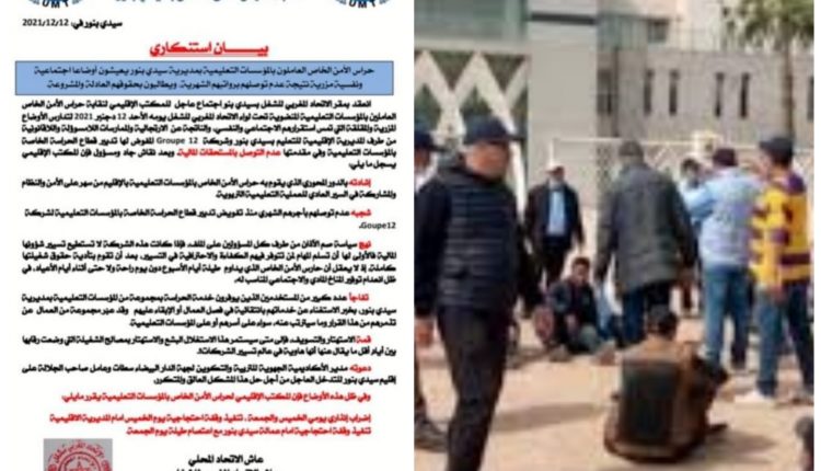 في ظل المعاناة المتكررة التي تعيشها هذه الفئة مع الشركات المفوص لها بتدبير خدمة توفير الأمن للمؤسسات التعليمية المتواجدة بتراب اقليم سيدي بنور ، وامام استهتار الشركة الجديدة بحقوق حراس الأمن وحرمانهم من الأجر منذ تمكينها من التدبير المفوض من لدن الاكاديمية الجهوية للتربية والتكوين ، عقد المكتب الاقليمي لنقابة حراس الامن الخاص العاملين بالمؤسسات التعليمية المنضوي تحت لواء الاتحاد المغربي للشغل ( UMT ) اجتماعا وقف من خلاله على المشاكل والمعاناة التي تعاني منها هذه الفئة مع المسؤولين على هذا الملف ، سواء الشركة المفوض لها أو مديرية التعليم بسيدي بنور .