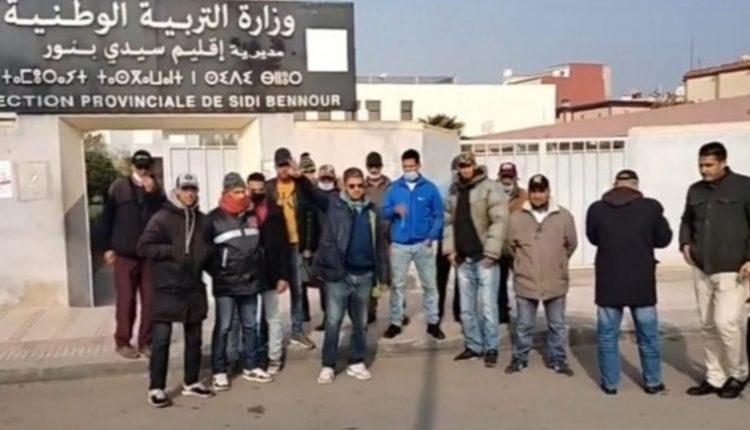 نظم حراس الأمن الخاص بالمؤسسات التعليمية، وقفة احتجاجية، أمام وزارة التربية الوطنية، إقليم سيدي بنور، بعد عدم توصلهم بمستحقاتهم منذ شهور.