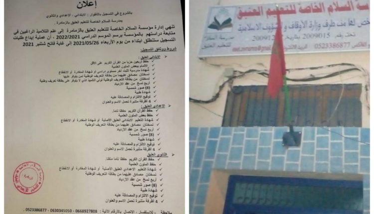 شرعت مدرسة حي السلام للتعليم العتيق بالزمامرة المرخص لها من طرف وزارة الأوقاف والشؤون الاسلامية في استقبال طلبات التسجيل برسم الموسم الدراسي 2021/2022.