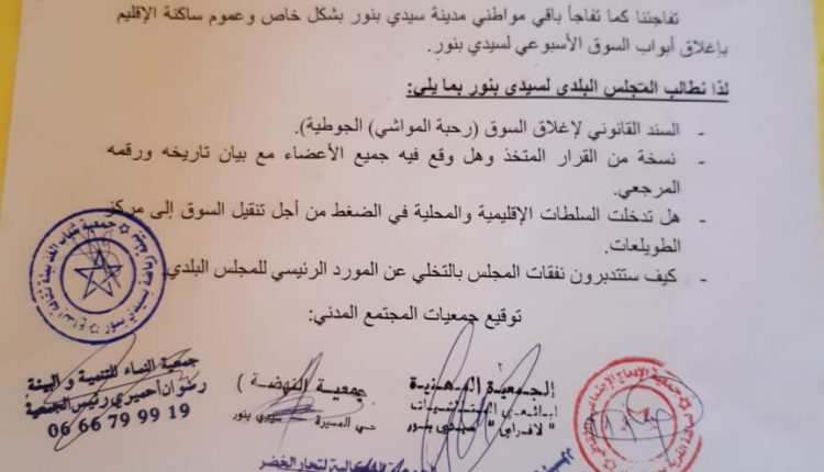 وقالت الجمعيات في رسالة وضعت بمكتب الضبط بجماعة سيدي بنور صباح اليوم الجمعة وتوصلت “سيدي بنور نيوز” بنسخة منها إنها تفاجئت باغلاق أبواب السوق الأسبوعي لسيدي بنور دون الكشف عن السند القانوني لإغلاقه (رحبة المواشي) و الجوطية). أو الخروج ببلاغ او نسخة من القرار المتخذ وهل وقع فيه جميع الأعضاء مع بيان تاريخه ورقمه المرجعي.