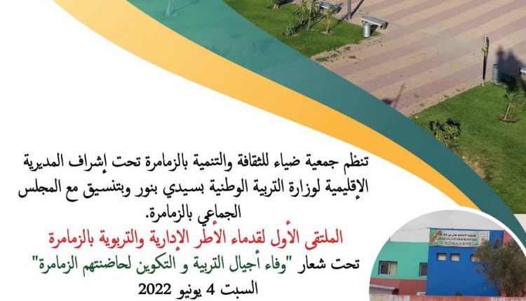 تحت شعار ” وفاء أجيال التربية والتكوين لحاضنتهم الزمامرة ” ، تنظم جمعية ضياء للثقافة والتنمية بتنسيق مع المديرية الإقليمية لوزارة التربية الوطنية والتعليم الأولي والرياضة بسيدي بنور، والمجلس الجماعي للزمامرة يوم السبت المقبل 4 يونيو 2022 الملتقى الأول للأطر التربوية والإدارية بالزمامرة بقاعة الاجتماعات للزمامرة، بداية من الساعة العاشرة صباحا.
