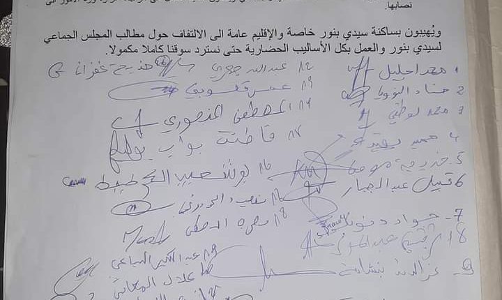 وجاء في البيان الذي توصلت “سيدي بنور نيوز” بنسخة منه وحمل توقيع أعضاء المجلس إن جميع الأعضاء يتابعون عن كتب آثار القرار الفوقي و التعسفي والفجائي والذي سيساهم الى حد كبير في ضرب الاقتصاد المحلي والتضامن الاجتماعي و إلى طمس معالم حضارية وثقافية وتراثية عمرت عقودا من الزمن.